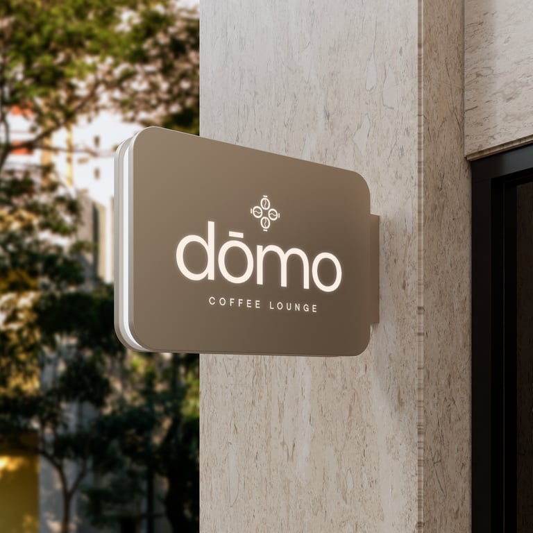 El nombre DŌMO viene del japonés «apreciación» o también «ser agradecido». Al inglés se traduce como «very», lo que al español sería «muy». Una expresión que los japoneses utilizan para, precisamente, demostrar aprecio hacia algo y/o alguien. El proyecto se trata de un coffee lounge que contará con barra de especialidades y cold brews con un toque japonés. Su isotipo es creado a partir de las letras Ō con su símbolo gramatical japonés que la caracteriza y un ligero toque en el centro que nos muestra un grano de café, utilizándose en aplicaciones como los vasos, uniformes (playeras), totebags (bolsas de tela), entre otras, como por ejemplo, el diseño de interiores del establecimiento. Una identidad sólida que nos presenta versatilidad dentro de su propia esencia.
